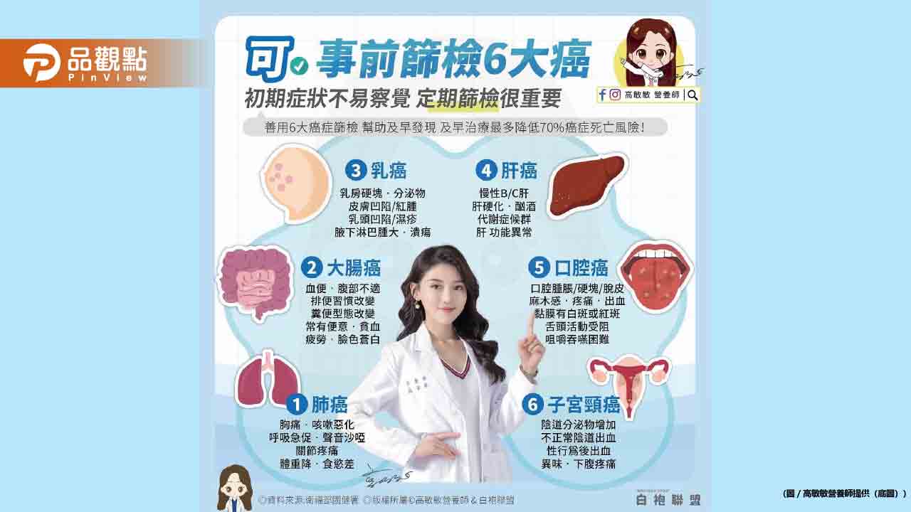 大家知道嗎?從2025年元旦開始,有許多新制正式上路,其中一項就是癌症篩檢補助擴大實施,癌症又稱為惡性腫瘤,是一種由細胞異常增殖引起的疾病,具有侵襲性和轉移性,且繁殖速度非常快,還能通過血液或淋巴系統擴散到身體其他部位,形成新的腫瘤,導致器官病變、功能喪失甚至死亡,部分癌症可透過定期篩檢來提早發現,而有些癌症卻是無法事前篩檢,必須透過日常活中,出現相似狀況就要留意,來看看可事前篩檢6大癌以及相關症狀