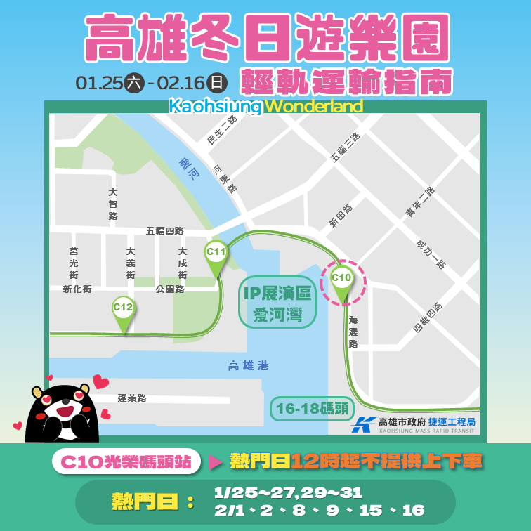 配合「2025 Kaohsiung Wonderland 冬日遊樂園」活動於1月25日至2月16日在愛河灣盛大登場,高雄輕軌將於1月25日起啟動春節疏運計畫。春節連假期間,輕軌尖峰時段班距將縮短至10分鐘一班,必要時更將機動增開加班車或區間車(籬仔內至哈瑪星),班距最密達8分鐘。