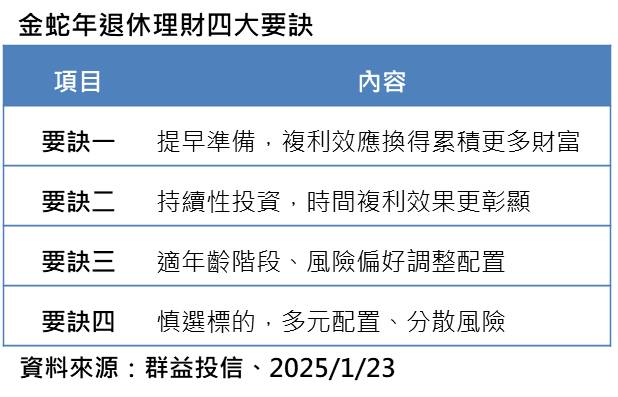 群益全民成長樂退組合基金經理人葉啟芳指出,退休理財或是其他理財規劃前,最重要的是先建立正確的理財觀念,包括(1)提早準備,透過時間複利效果換得更多退休資產;(2)持續性投入,市場總有波動起伏,景氣亦有循環更迭,保持耐心長期穩定投入,才更有機會達成目標;(3)隨年齡增長與風險偏好改變而調整資產配置內容,兼顧投資效益與風險管理;(4)慎選標的,年輕人因為年紀較輕,對於市場波動的承受度較高,建議初期可將資金投入成長性較高的股票型產品,包括台灣民眾最為熟悉的台股基金,單一市場或區域型股票基金,如美國、印度、中國或東協基金等等,都值得參考及留意。