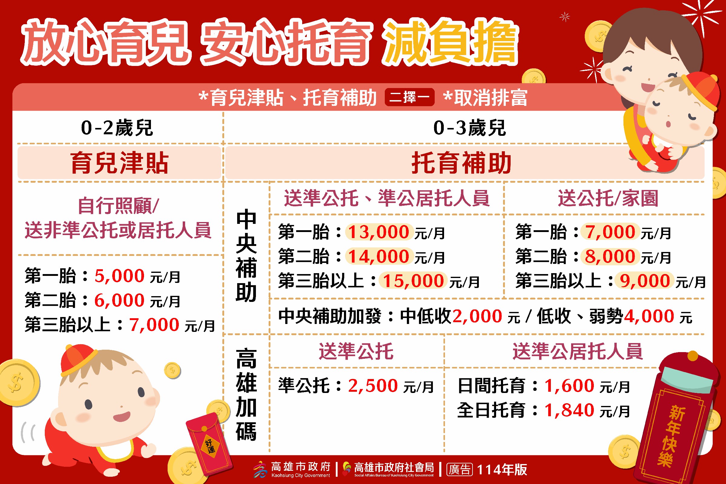 高雄市響應中央「0至6歲國家一起養」政策,提供育兒津貼與托育補助。家長若選擇自行照顧未滿2歲孩童,可領取每月5,000元育兒津貼;送托公托中心則可獲得每月7,000元的中央補助;選擇準公共托嬰中心或居家保母者,每月可獲得1萬3,000元補助。此外,高雄市政府自112年起再加碼,日間托育送托準公共保母者可再獲1,600元補助,使中央與市府總補助額達1萬4,600元;送托準公共托嬰中心者則可再獲2,500元補助,總計補助額達1萬5,500元。市府更推動「線上申請」服務,讓家長可隨時隨地完成津貼與補助申請,省時又便利。
