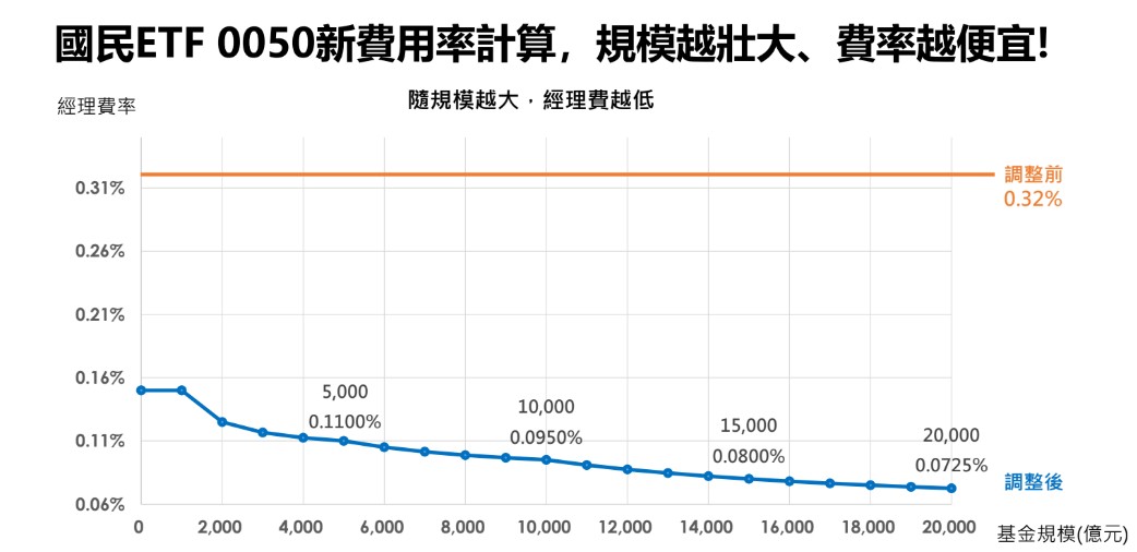 元大投信日前也趕在過年前,宣布調降0050經理費及保管費,其中,經理費由0.32%改為累進式計算(基金規模中的1千億元降為0.15%,其餘3469億元降為0.1%),保管費則由0.035%降為0.03%。