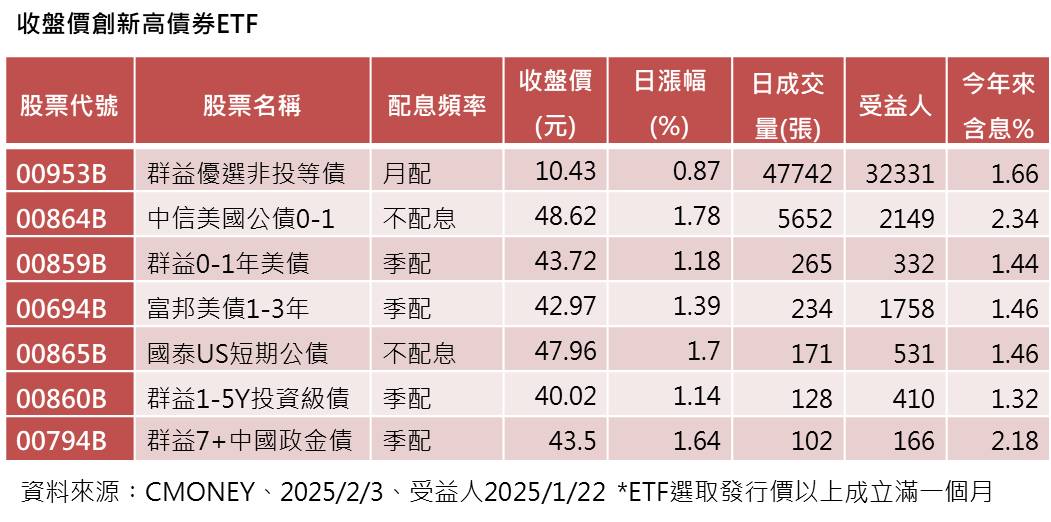 金蛇年開盤首日,台股大跌830點,不過,債券ETF強勢演出,其中,包括00953B群益優選非投等債、00864B中信美國公債0-1、00859B群益0-1年美債、00694B富邦美債1-3年、00865B國泰US短期公債、00860B群益1-5Y投資級債、00794B群益7+中國政金債共7檔債券ETF,昨天收盤價創新高,讓3.7萬位受益人帳面資產上揚。