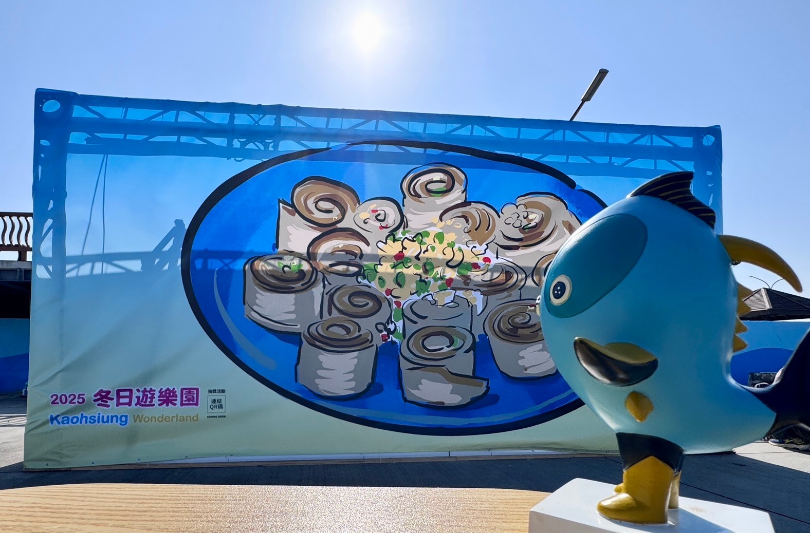 黃登福局長進一步介紹,高雄巨大水產展品共有五款,分別展現在不同行政區,包含梓官區的「鏽斑蟳」、永安區的「龍膽石斑」、林園區的「白帶魚」、茄萣區的「烏魚子」及前鎮區的「阿根廷魷魚」,各具特色,吸引大量遊客拍照打卡。