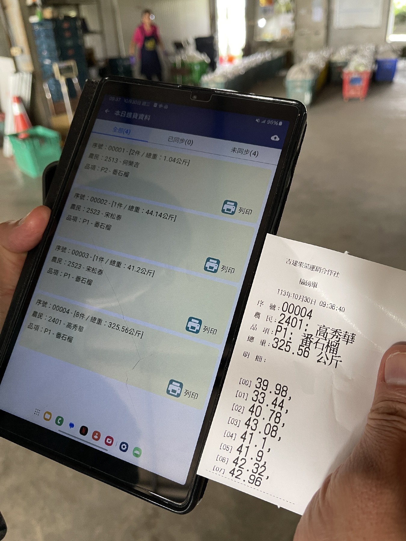 農友導入智慧農業後的實際案例,充分展現科技應用的優勢。例如,杉林區金恩典農場農友朱映帆導入電動自走式搬運車,原本4公頃荔枝園施肥需10人花費2天,如今僅需1人1天即可完成,大幅降低人力與時間成本。此外,燕巢區吉建果菜運銷合作社則導入智慧磅秤系統,以往番石榴重量需人工作手寫記錄,不僅易出錯且保存不便,如今智慧磅秤可自動秤重、列印標籤並同步電腦記錄,使作業更加精確高效。