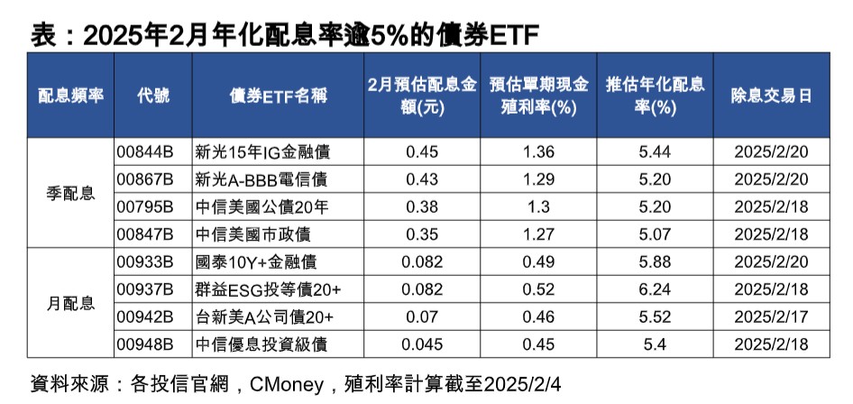 分析師表示,川普關稅新政上路,對金融市場掀起波瀾,訴求安心投資的債券投資人,建議透過債券ETF,作為資產配置低波動核心部位,以2月除息的債券ETF來看,不少投資等級債、金融債ETF等,預估年化配息率皆5%以上,想領息的投資人,得在除息日前買進。