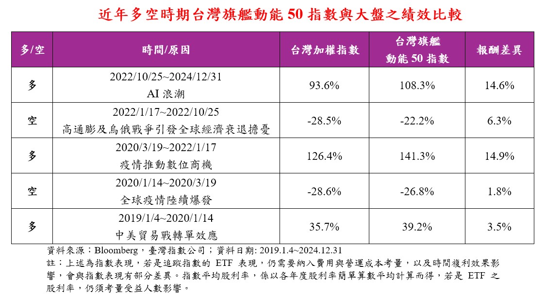 該ETF擬任經理人林威宇表示,動能簡單來說,就是標的持續維持相同方向的趨勢;表現好的股票可能會持續上漲,表現差的股票可能會持續走弱,類似強者恆強的概念。回顧「台灣旗艦動能50指數」近年來多空時期表現,在三次多頭時期皆優於大盤,在兩次空頭時期也表現優異,關鍵在於指數編制規則納入低波動度的篩選。