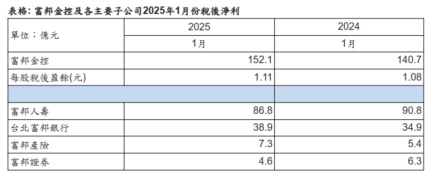 金控2025年1月獲利全部出爐,其中,富邦金稅後淨利152.1億元,每股稅後盈餘(EPS)為1.11元,蟬聯金控獲利王;子公司部分,台北富邦銀行1月稅後淨利創下歷史單月新高紀錄。