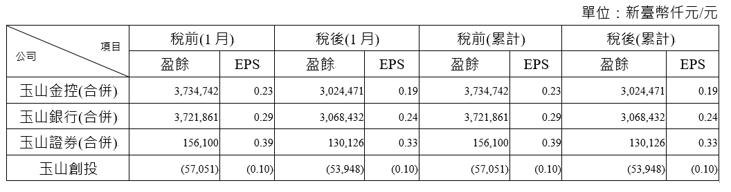 玉山金1月稅後盈餘30.2億元,較去年同期增加7.95%, EPS為0.19元。主要子公司玉山銀行累計稅後盈餘30.7億元,年增5.39%;玉山證券1.3億元;玉山創投虧損0.5億元。