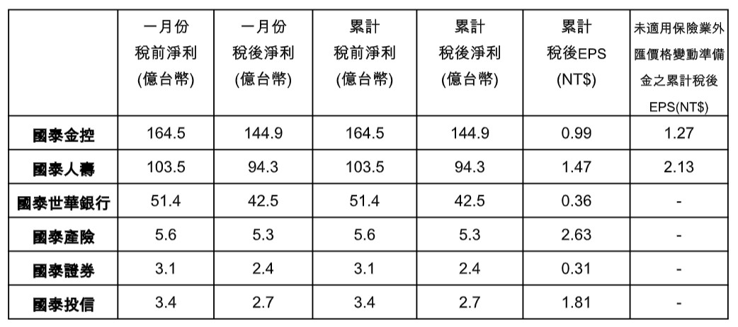 國泰金1月稅後淨利144.9億元,年成長54%,EPS達0.99元。各子公司國泰世華銀行、國泰產險及國泰投信稅後淨利皆創同期新高。
