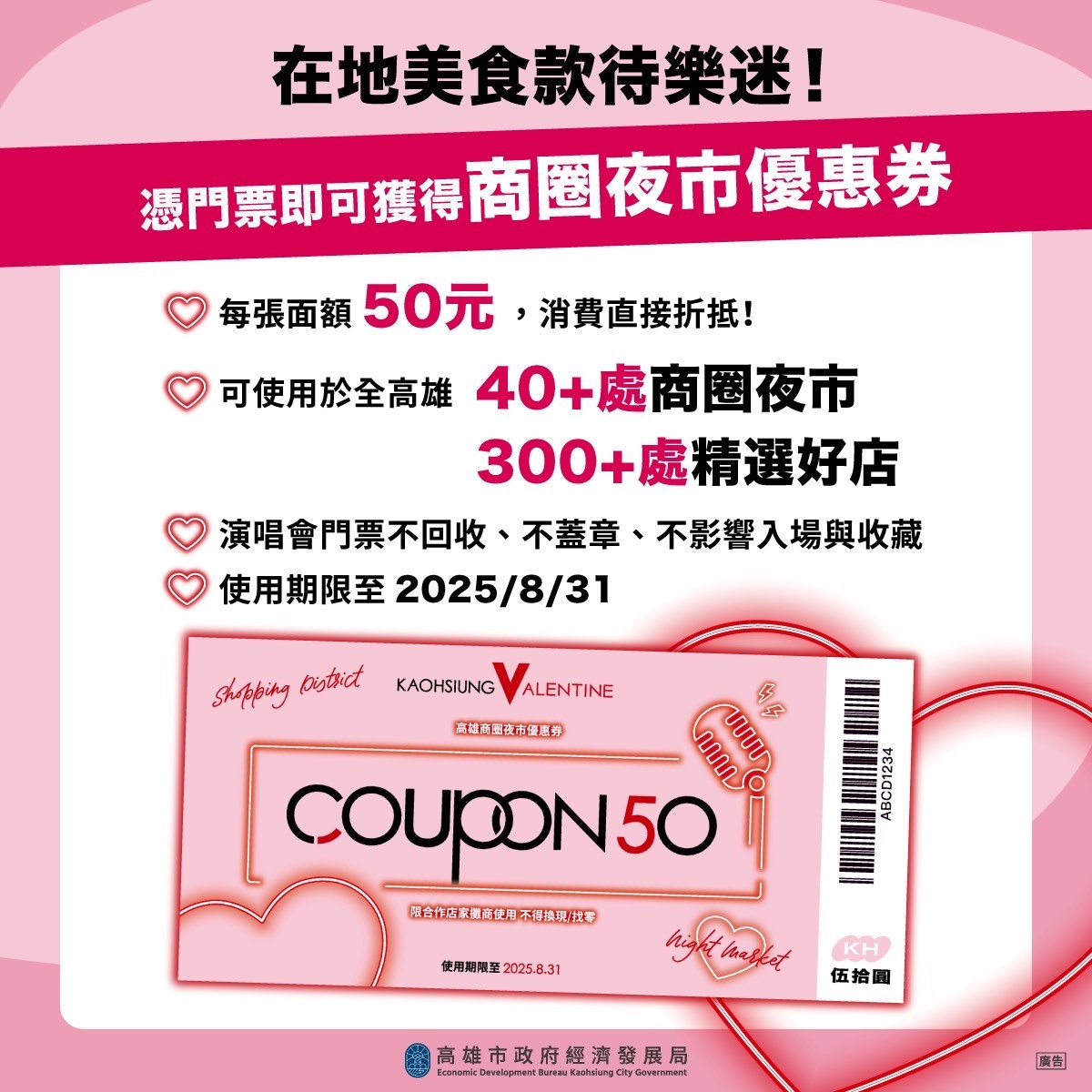圖說:憑指定演唱會門票到6處指定捷運站即可兌換50元商圈夜市優惠券。(圖片來源:高雄市經發局提供)