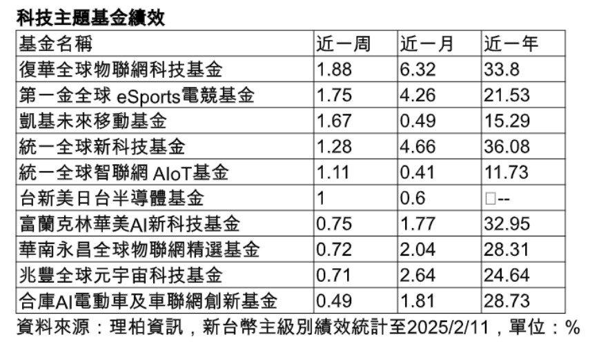 理柏資訊統計(截至2/11),復華全球物聯網科技、第一金全球eSports電競、凱基未來移動、統一全球新科技、統一全球智聯網 AIoT、台新美日台半導體等基金,近1周績效漲幅逾1%,富蘭克林華美AI新科技基金也有0.75%漲勢,都優於投信投顧公會分類全球一般股票型類型平均的負0.03%。