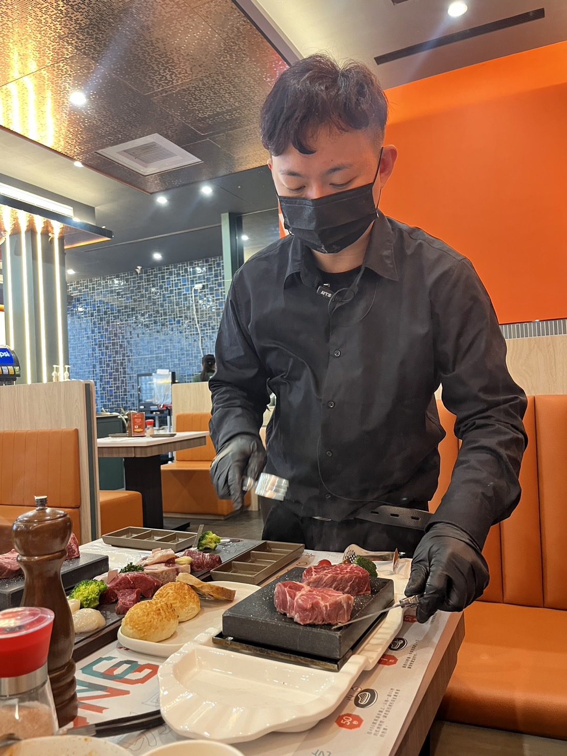 圖說:服務人員會先幫忙炙烤到適宜品嚐的熟度,再由消費者自行針對口味進行微調。(圖片來源:記者呂宗正拍攝)