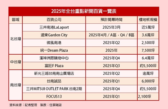 今年南台灣新開幕的百貨公司包括:台南的「新光三越南山台南廣場店」、「三井MITSUI OUTLET PARK台南2期」以及「台南誠品」,還有高雄的「FOCUS13」。