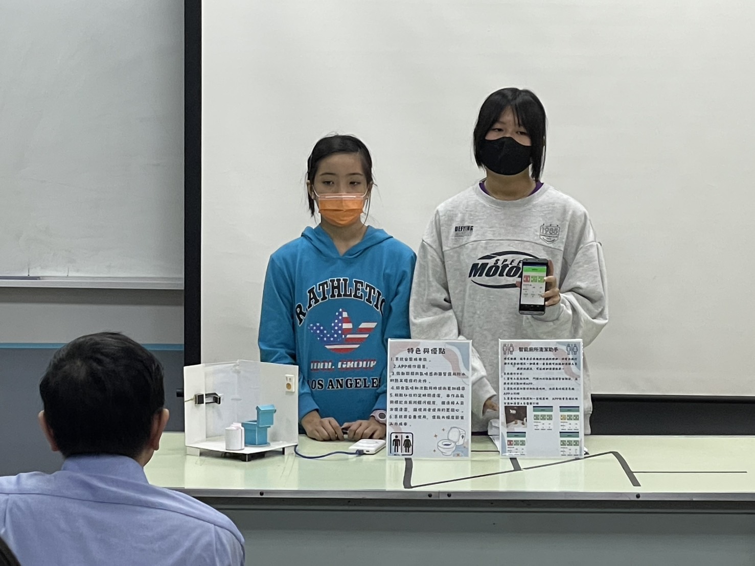 另外王彥晴、簡仲婕兩位同學為減輕清潔人員辛苦,發明「智慧廁所清潔助手」,能讓清潔更為智慧化,藉由感測器偵測廁所使用頻率與臭味程度,回傳到清潔人員手中APP,既不會白跑,也可以提供良好如廁空間,獲得「便利生活類」銀牌。