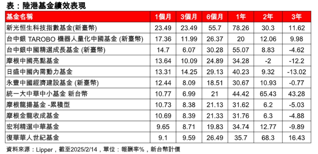 港股農曆蛇年開盤以來,一路向上攻擊,累計恒生指數漲幅已達13.6%,而恒生科技指數更是飆漲約20%。連帶地,也帶動陸港相關基金績效大發,截至上週五(2/14)為止,近一個月漲幅9%起跳,其中,新光恒生科技指數基金漲幅更高達23.4%,淨值創下近6個月新高。