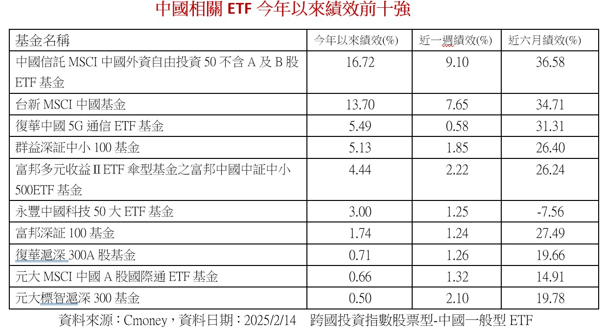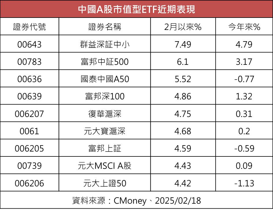 也有法人指出,近日外資機構如高盛、瑞銀等紛紛看好中國,上調股指目標價,在市場投資信心提振下,激勵中國股市表現,2月以來,深圳綜合指數上漲5.04%、上海綜合指數上漲2.27%,連帶中國A股市值型ETF二月以來績效表現也水漲船高。