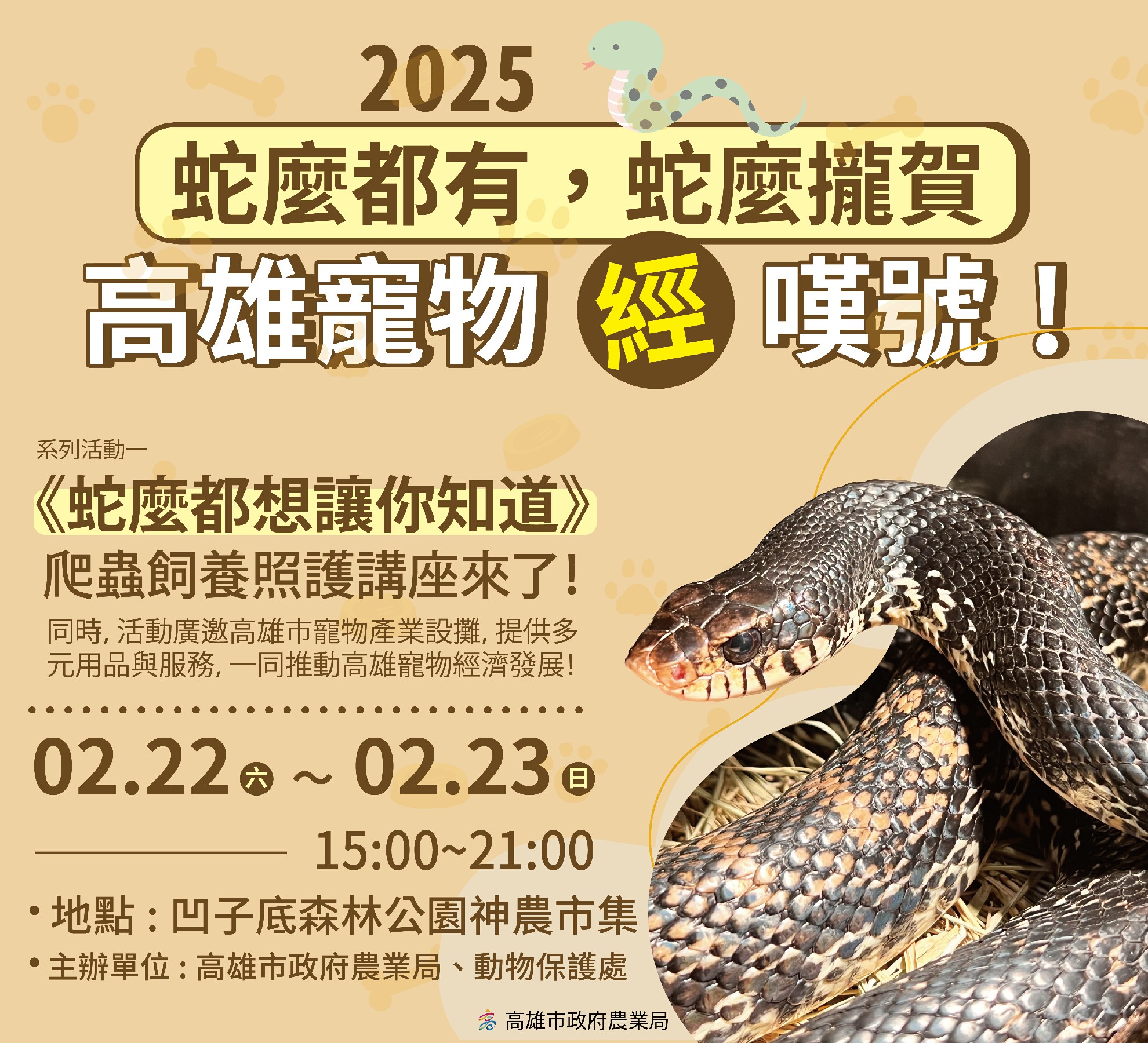 除了品味農產與美食,市集更結合高雄市動物保護處舉辦「2025蛇麼都有」寵物活動,邀請50家在地寵物相關業者共同參與,帶來犬貓義診、美容服務、萌寵認養及爬蟲類飼養講座等精彩活動。特別規劃的「蛇麼都想讓你知道」爬蟲類講座,將由專業講師分享爬蟲類正確飼養知識,讓飼主深入了解如何照顧這些獨特的寵物,現場更有機會近距離觀賞各種奇特的爬蟲萌寵。