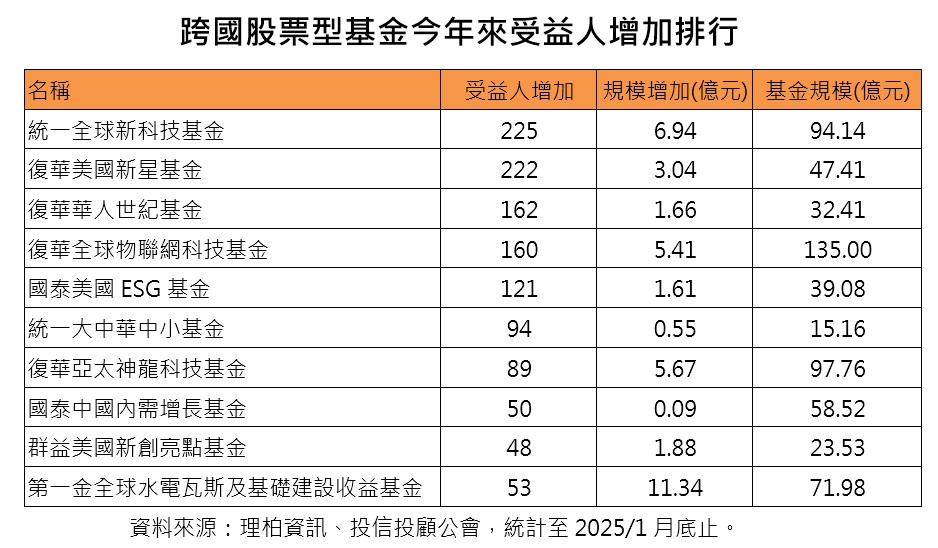 包括統一全球新科技、復華全球物聯網科技等科技主題基金,復華美國新星、國泰美國ESG等美股基金以及隸屬大中華股票型的復華華人世紀等5檔基金,今年來受益人數增加突破3位數、規模同步增長逾億元最為突出。