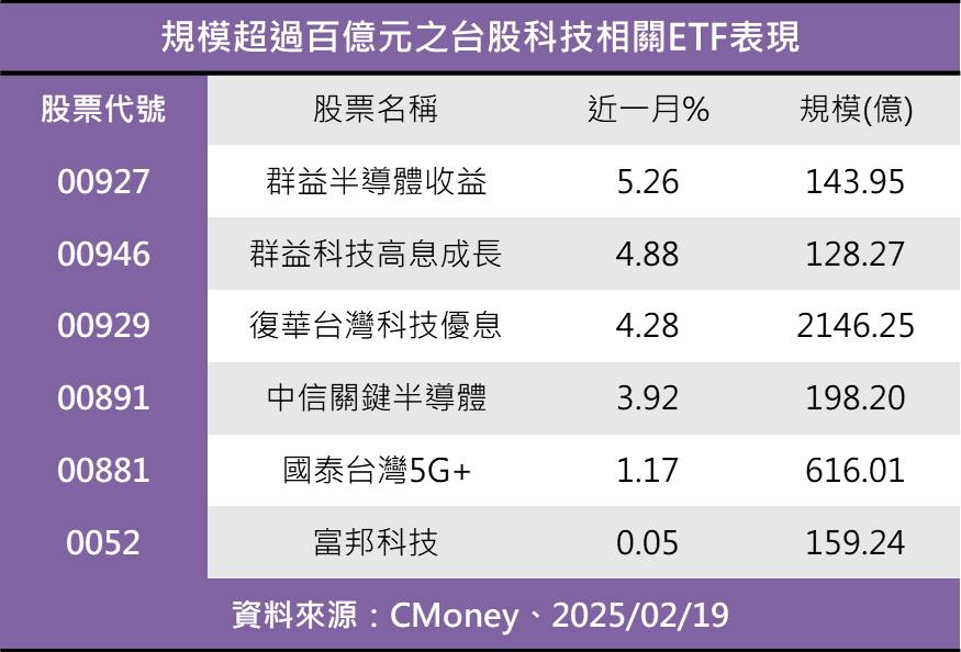 觀察近期規模超過百億以上之台股科技相關ETF表現,共計有6檔,近1個月都繳出正報酬,其中以00927群益半導體收益漲幅5.26%居首,此外,00946與00929也分別有4.88%和4.28%的漲幅。