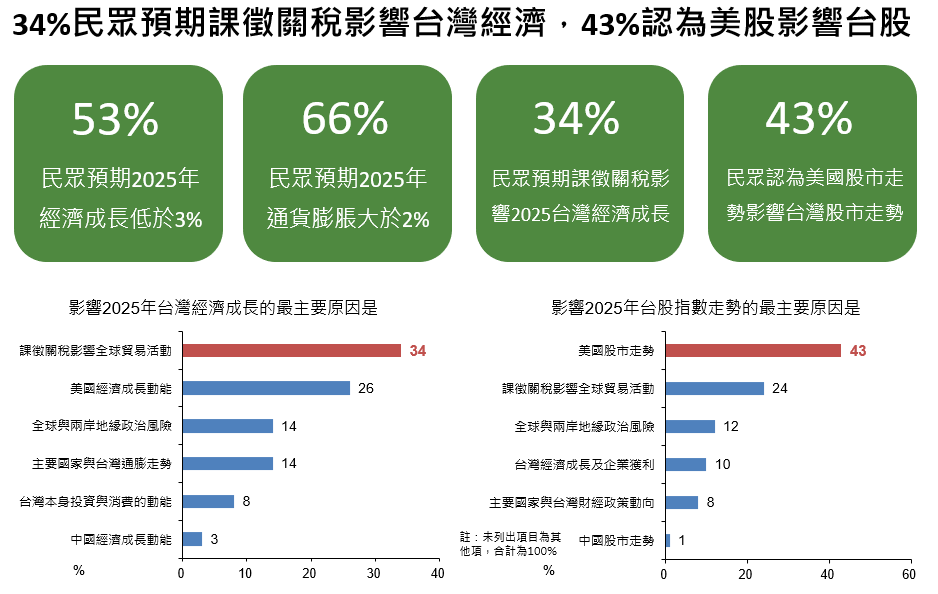 ●53%民眾預期2025年經濟成長率低於3%,66%預期通膨高於2%: