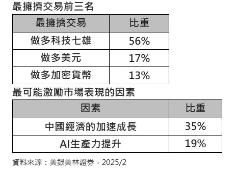在擁擠交易方面,做多科技七雄仍為最擁擠的交易,做多美元居次;最可能激勵市場表現的因素是中國經濟的加速成長,其次為AI生產力提升。