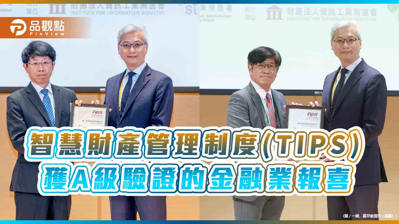 經濟部產業發展署今天舉辦「台灣智慧財產管理制度(TIPS)」授證典禮,其中,富邦金控、第一銀行都是連續三次通過A級驗證,業者也開心領獎,跟外界分享喜訊。