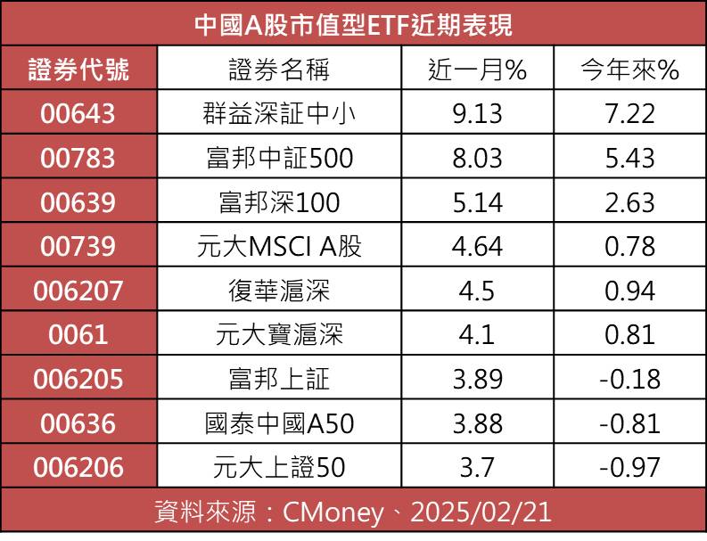 連帶地,投信發行的中國股票相關ETF,近期表現強勢,以A股市值型ETF來看,近1個月全數繳出正報酬,其中,以布局中小型股為主的ETF表現最俏,像是(00643)群益深証中小近一月累積漲幅9.13%,漲勢第一。