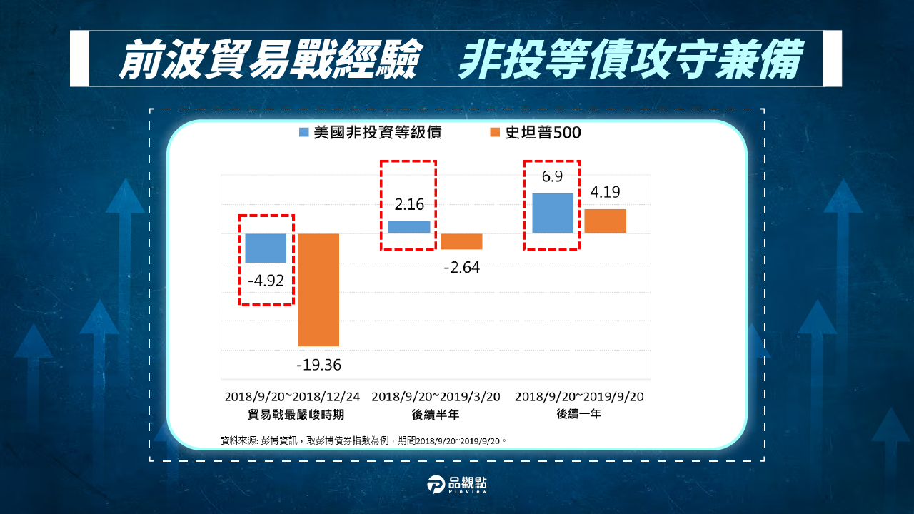 法人分析,回溯川普上次總統任期,在2018年掀起的貿易戰最嚴峻時期,美股S&P 500指數波段下跌近2成,當時,美國非投資級債儘管受波及,但在高債息的緩衝下,同期間跌幅限縮在5%以內(如下圖),約僅S&P 500指數的4分之1跌幅。
