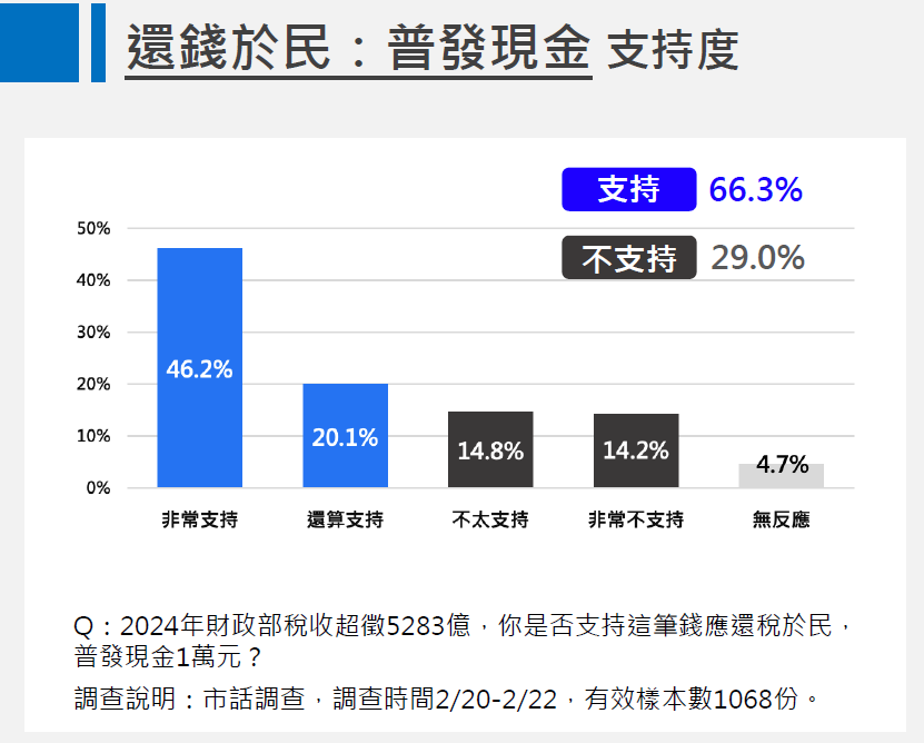 配合國民黨立法院黨團宣布推動「還錢於民2.0」,全民普發現金一萬元的宣誓,藍營智庫國家政策研究基金會今(25)日發布「還錢於民:普發現金」民調,提問內容為「2024年財政部稅收超徵5283億,你是否支持這筆錢應還稅於民,普發現金1萬元?即『還錢於民:普發現金』」,抽樣1068份訪問後,得到有66.3%支持,29%不支持的結果。