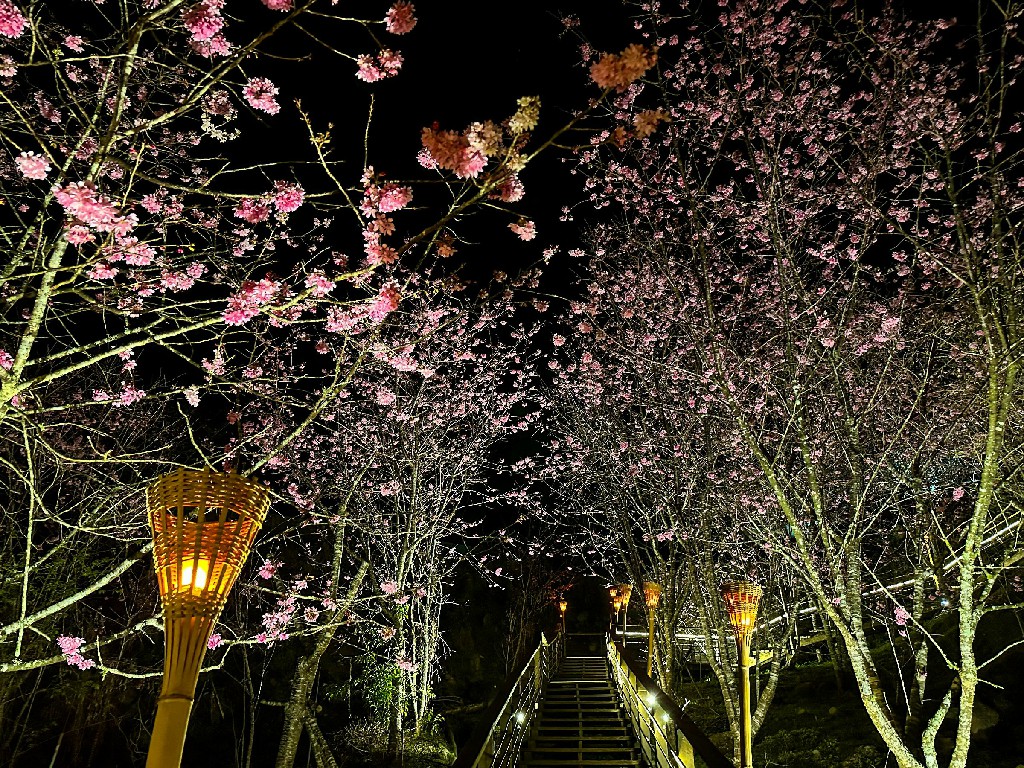 ↑圖說:「石棹櫻之道」夜晚則透過燈光點綴,展現截然不同的夢幻氛圍。(圖片來源:嘉義縣文觀局提供)