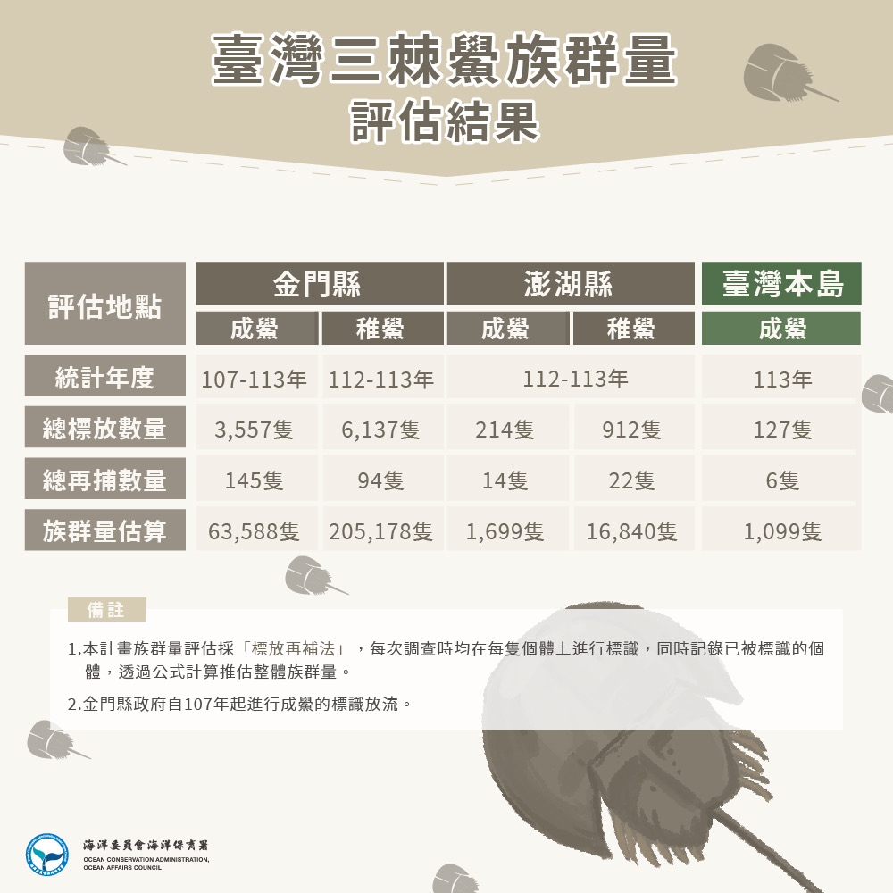 為精準掌握三棘鱟族群數量,海保署自112年起委託國立中山大學,並與金門縣水產試驗所、水試所澎湖中心合作,運用標識再捕法進行分析。調查結果顯示,金門縣約有63,588隻成鱟與205,178隻稚鱟,澎湖縣則約有1,699隻成鱟與16,840隻稚鱟,顯示這兩地仍是主要的三棘鱟棲地。