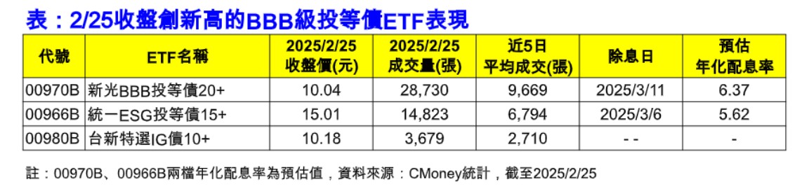 法人表示,2025年具安全資產特性的投資等級債ETF,近期在市場交投熱絡,像新光BBB投等債20+(00970B)、統一ESG投等債15+(00966B)等ETF、台新特選IG債10+(00980B)等、都是去年第四季新募集、訴求BBB級投等債的月配ETF新兵。由於BBB級投資等級債,本身兼具高債券信評、高票息率保護,現階段佈局這類債券ETF,不論是ETF平均到期殖利率或票息率,皆有5~6%的相對高水準。