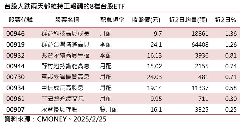 台股本週以來持續拉回,統計週一、週二共計下跌444點,跌幅1.87%,不過,仍有8檔台股ETF抗跌逆勢上揚,其中以(00946)群益科技高息成長1.36%漲幅居冠,(00919)群益台灣精選高息的1.26%居次;同樣地,全球股票型ETF也有抗跌英雄,法人統計近四個月市場震盪期間,每個月都能正報酬(含配息計算)的有3檔,分別是國泰網路資安(00875)、凱基全球菁英55(00926)、國泰全球品牌50(00916)。