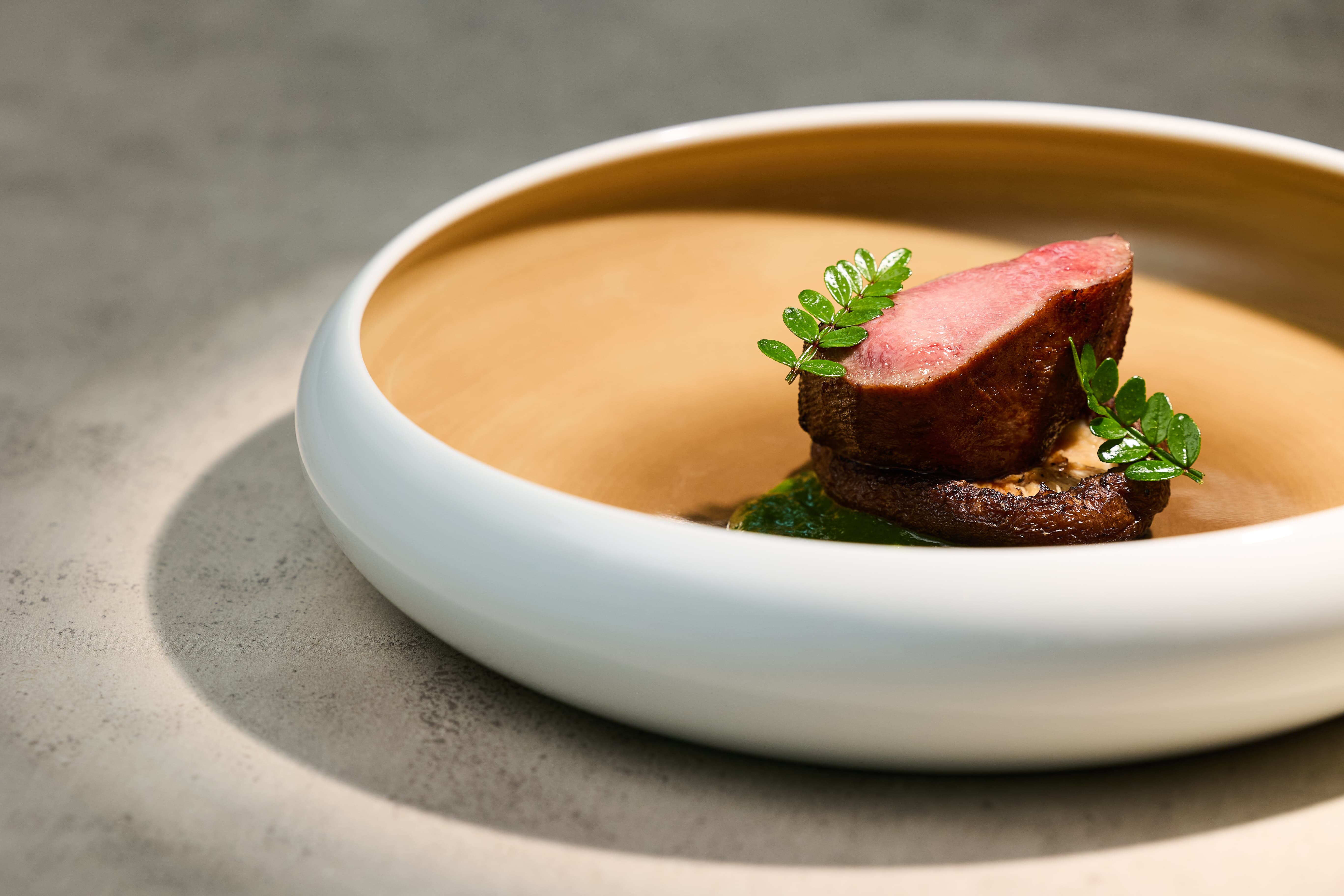 Grill Ukai 以春天的輕盈氣息入饌,為饕客獻上細膩多層次的西式料理。「煙燻鮭魚 鮭魚卵 布列塔尼餅」以櫻桃木緩緩燻製鮭魚,溫潤木質香氣襯托鮭魚的細膩油脂,搭配初春花苗與鮮嫩生菜,營造繽紛視覺饗宴。「北海道干貝 茴香 柳橙沙拉」則選用檸檬水舒肥過的北海道干貝,保留彈嫩口感,與新鮮柳橙的酸甜層層交融,突顯海味鮮甜。「櫻花蝦御飯」則以東港盛產的櫻花蝦搭配龍蝦與柴魚高湯熬煮的米飯,口感酥脆且滿溢海味鮮香,完美詮釋春季漁獲的極致美味。