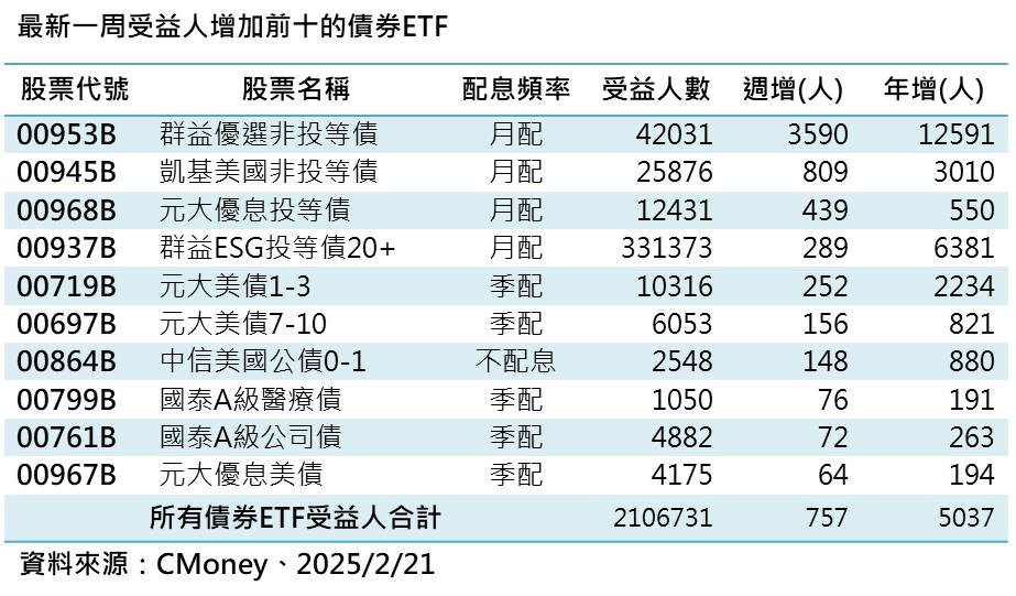 整體來看,截至2月21日為止,債券ETF受益人單週增加757人,整體人數來到210萬6731人。在101檔債券ETF中,單周受益人增加的有40檔,其中,(00953B)群益優選非投等債,周增3590人最多,是單周債券ETF人氣王。進一步觀察單週受益人增加最多的前十檔,前2檔都是非投等債。