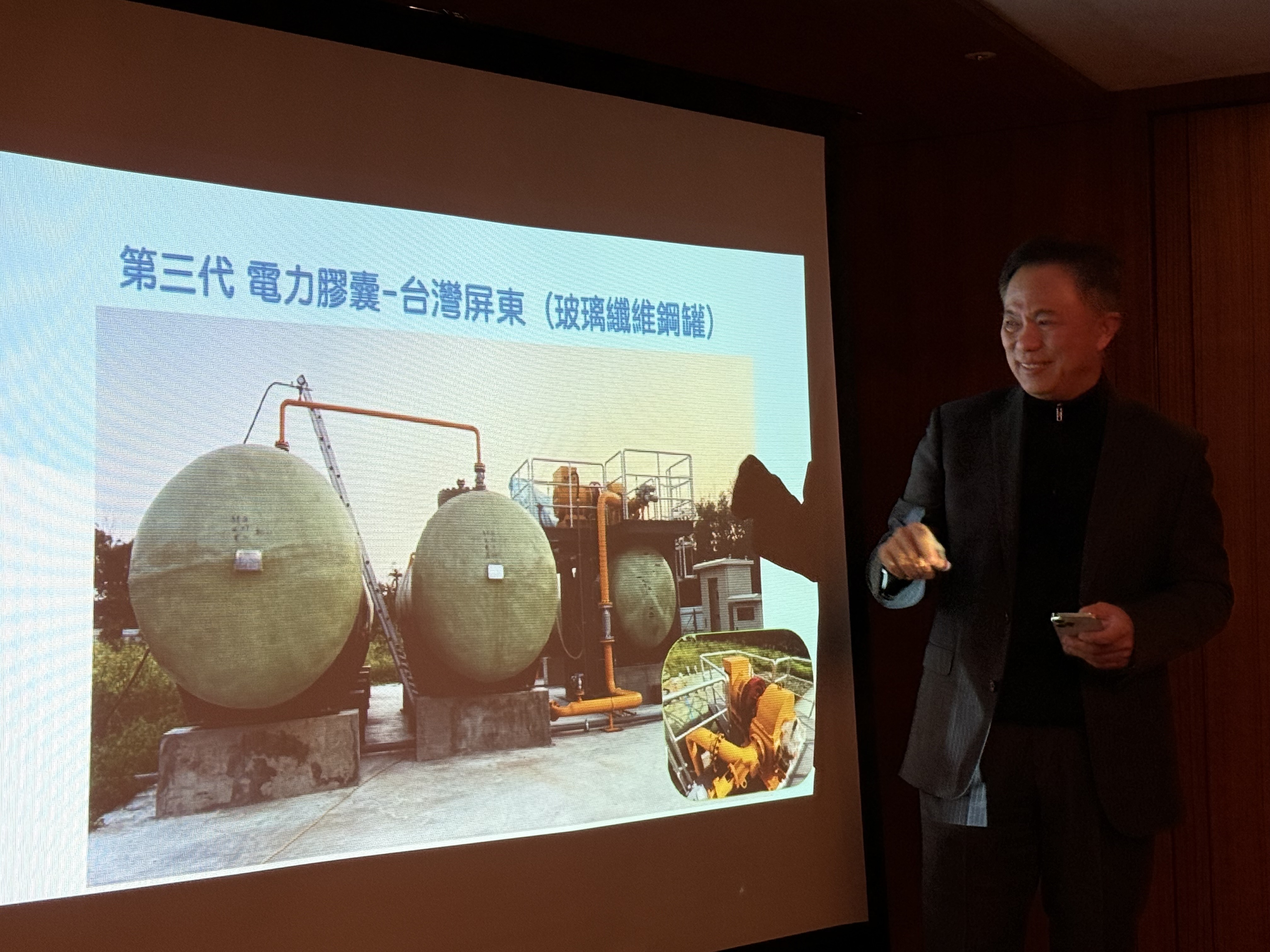 丁廉君說,第一代的概念驗證,是小型系統驗證、到了第二代,則是運行測試,以鋼瓶儲能運行,而最新的第三代技術(Power Capsule 400),則是採用GFRP(玻璃纖維強化塑膠),重量減輕,成本大降,只有第二代的10分之1,具備更高的經濟性與市場競爭力(如上圖,記者李錦奇攝影)。