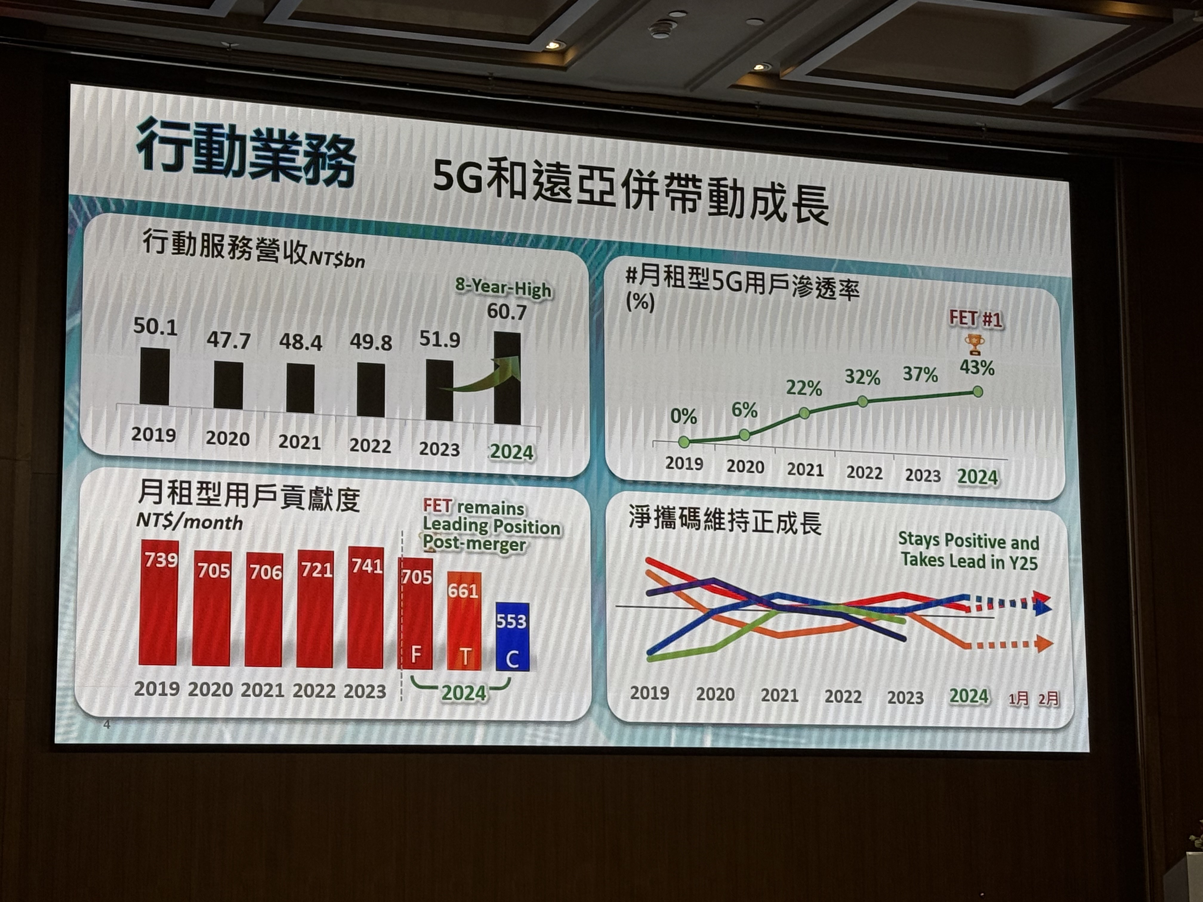 行動業務方面,受惠遠亞合併擴大經濟規模,遠傳去年行動服務營收創下近8年來新高,月租型用戶每月平均貢獻度(ARPU),續居業界之冠;月租型5G用戶滲透率,由2021年的22%,成長至2024年的43%,續居業界第一,井琪表示,今年目標是拚上50%。