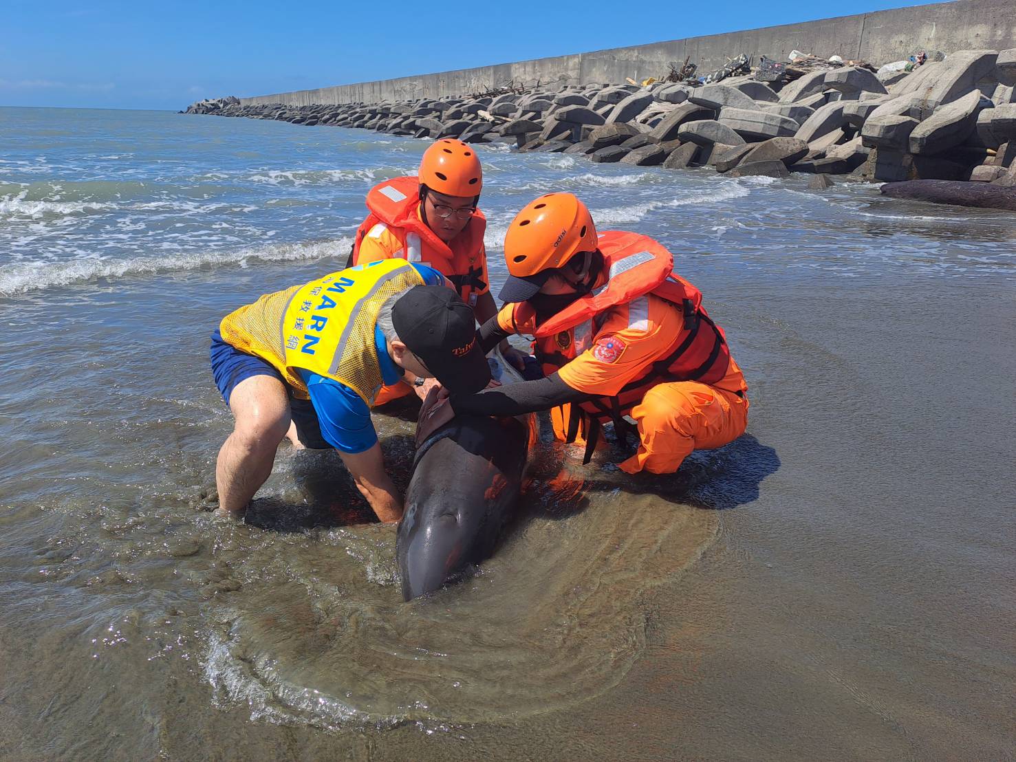↑圖說:臺南青山漁港發生小虎鯨集體擱淺,MARN救援團隊趕至現場進行保定作業。(圖片來源:海洋保育署提供)