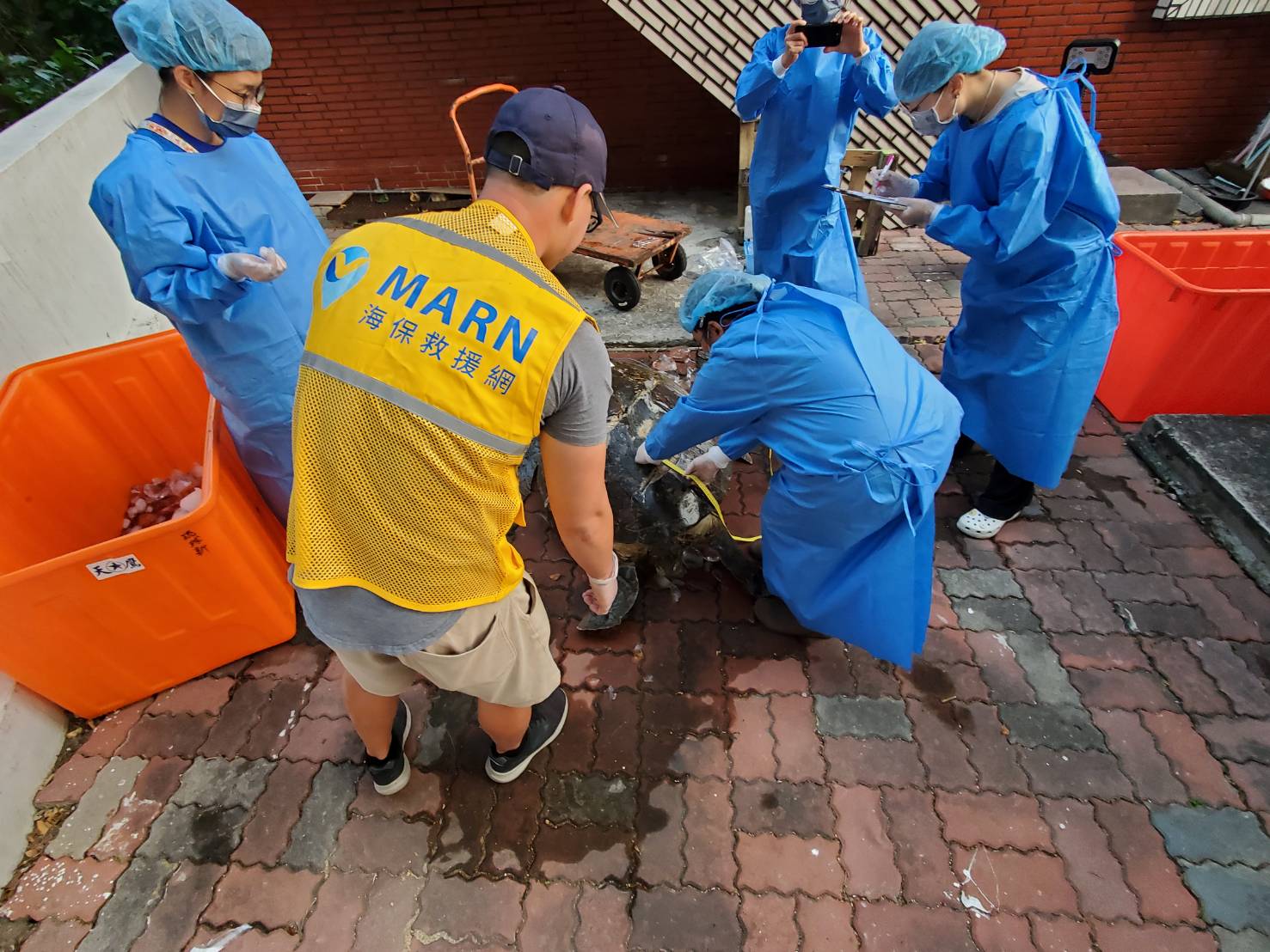 ↑圖說:MARN救援團隊協助海生館獸醫進行屏東綠蠵龜擱淺個體剖檢及採樣。(圖片來源:海洋保育署提供)