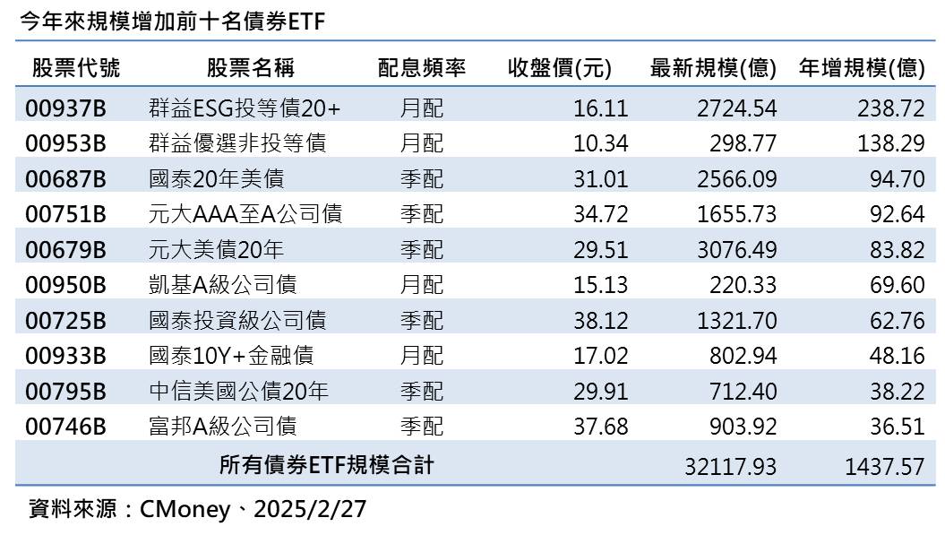 整體來看,投信發行的債券ETF,總規模截至2月底,已創高突破3.21兆元,今年前2個月大增1437.57億元。進一步觀察,規模增逾百億元的產品共有2檔,包括(00937B)群益ESG投等債20+增加238.72億元,其次是(00953B)群益優選非投等債。