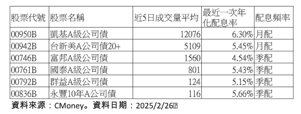 再看市場上的6檔A級債,最近一次配息的年化配息率,大部分都在5%以上,其中,凱基A級公司債(00950B)近5日平均成交量達萬張以上,三月預估配息0.079元,年化配息率來到6.3%,為所有A評級債券ETF的年化配息率冠軍。