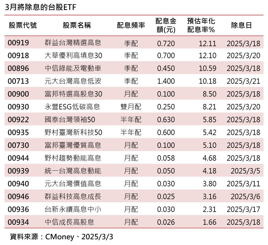 台股ETF三月除息大戲即將登場,有15檔即將輪番上陣,以昨(3)日收盤價計算,群益台灣精選高息(00919)預估年化配息率12.11%最高,大華優利高填息30(00918)也達12.1%。