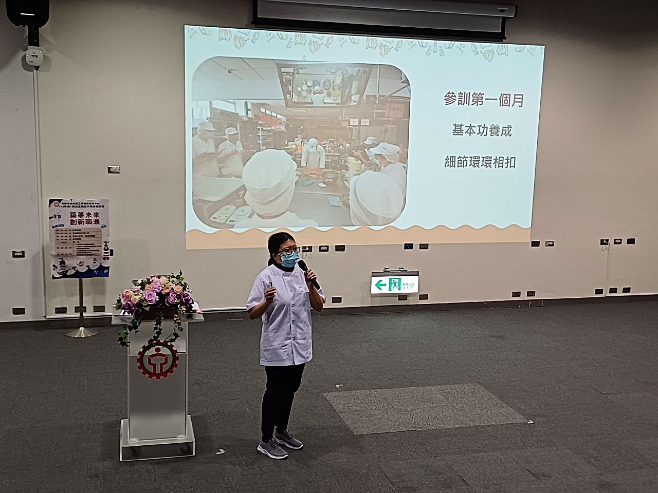 同樣來自112年度第2梯次的食品烘焙班結訓學姊蔡承芳,則分享了她從學習到就業的心路歷程。目前已擁有三張烘焙相關證照的她,透過訓就中心的媒合,已在職場工作一年多。她回憶起剛入學時,既期待又迷茫,但透過完整的訓練課程,她從基礎紮根,掌握從配方設計、攪拌發酵到產品介紹的各環節。她強調,訓就中心不僅傳授技能,更培養學員在職場上的應變能力,如今她已能獨立應對工作挑戰。她勉勵學弟妹們:「扎穩基礎,持續提升自己,考照順利,就業成功!」