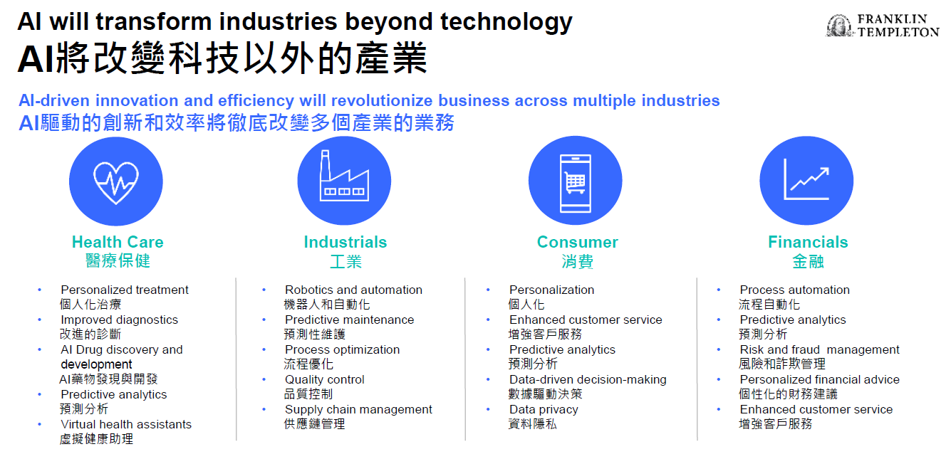 1. 人工智慧(AI):已接棒個人電腦、網際網路、行動裝置、雲端成為劃世代的大趨勢,未來,AI可能創造數兆美元的機會,並為科技、醫療保健、教育、汽車、消費等眾多產業帶來顛覆性影響。隨AI持續發展,AI基礎設施、AI應用程式、物理AI將成市場關注焦點,而目前才剛處於AI時代的開端。