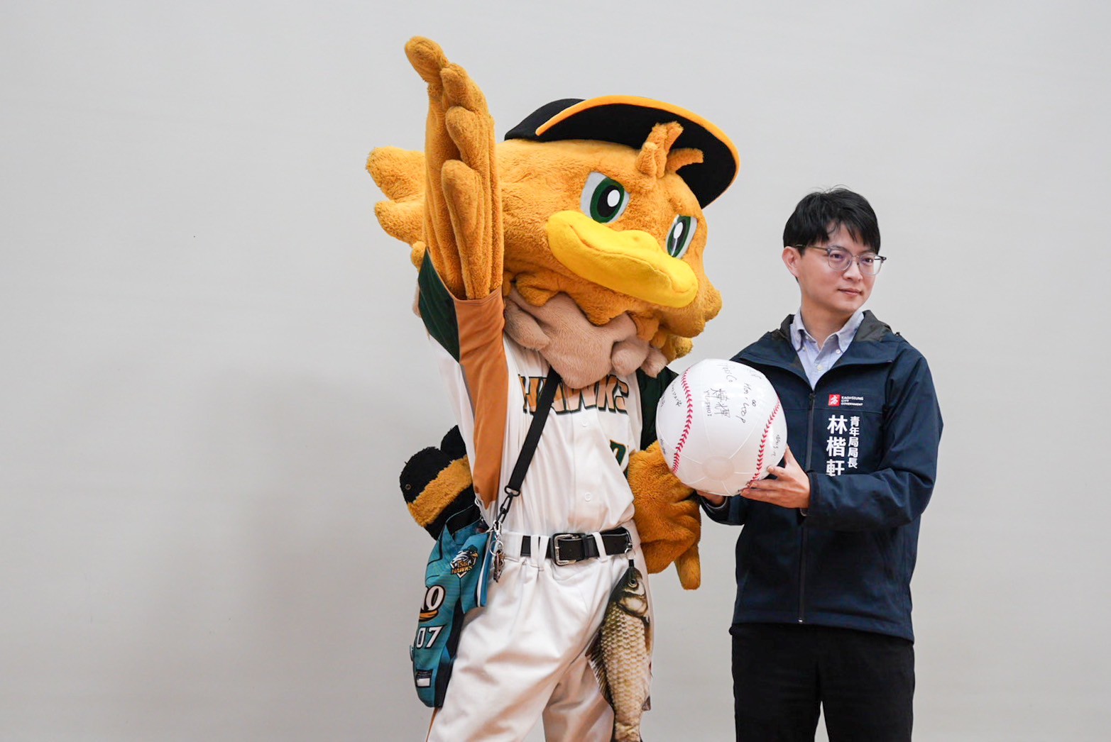 圖說:高雄市政府新任青年局局長林楷軒5日參加新媒體人才就業媒合會,與台鋼雄鷹吉祥物「TAKAO」一同揭開序幕。(圖片來源:高雄市青年局提供)