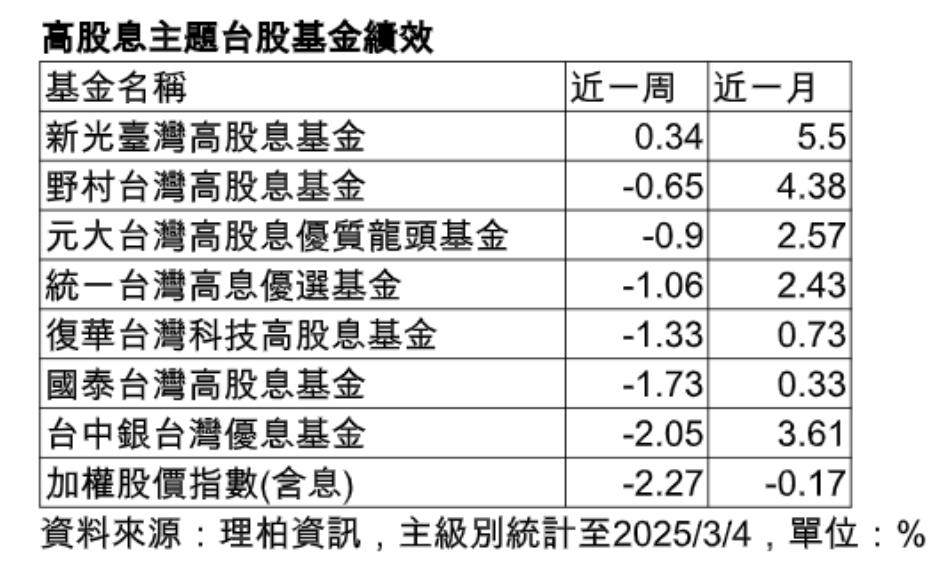 截至3月4日為止,台股近1周跌幅逾2%,不過,新光臺灣高股息,逆勢上漲0.34%,野村台灣高股息、元大台灣高股息優質龍頭、統一台灣高息優選、復華台灣科技高股息、國泰台灣高股息基金,跌幅不到2%,近1月則都維持正報酬,都是近期強勢指標。