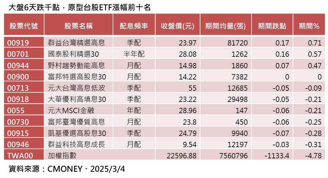 台股ETF也同樣有抗跌英雄,像是群益台灣精選高息(00919)、國泰股利精選30(00701)、野村趨勢動能高息(00944),在2月24日~3月4日的6個交易日裡,逆勢上漲,且都是高股息ETF。