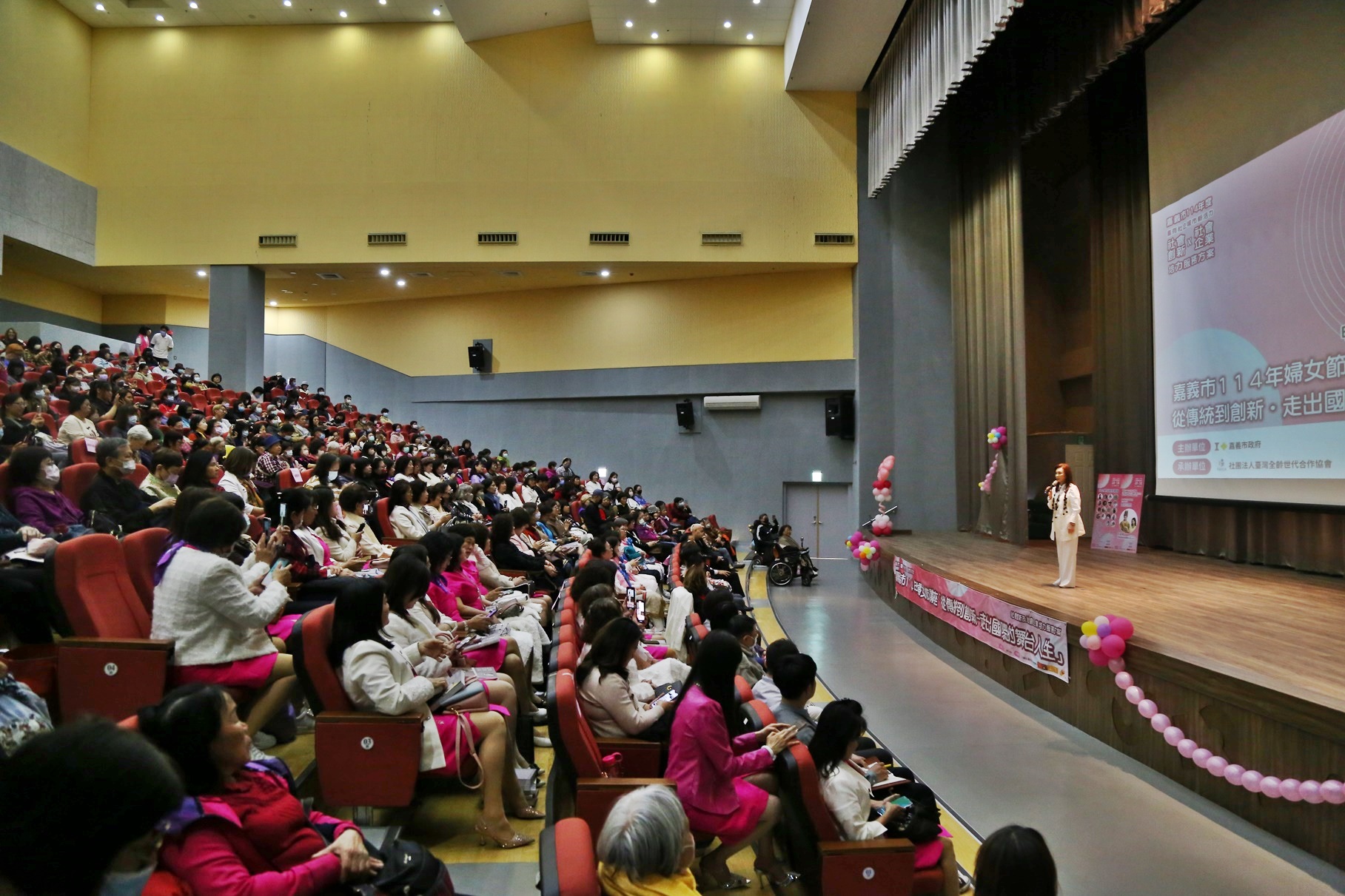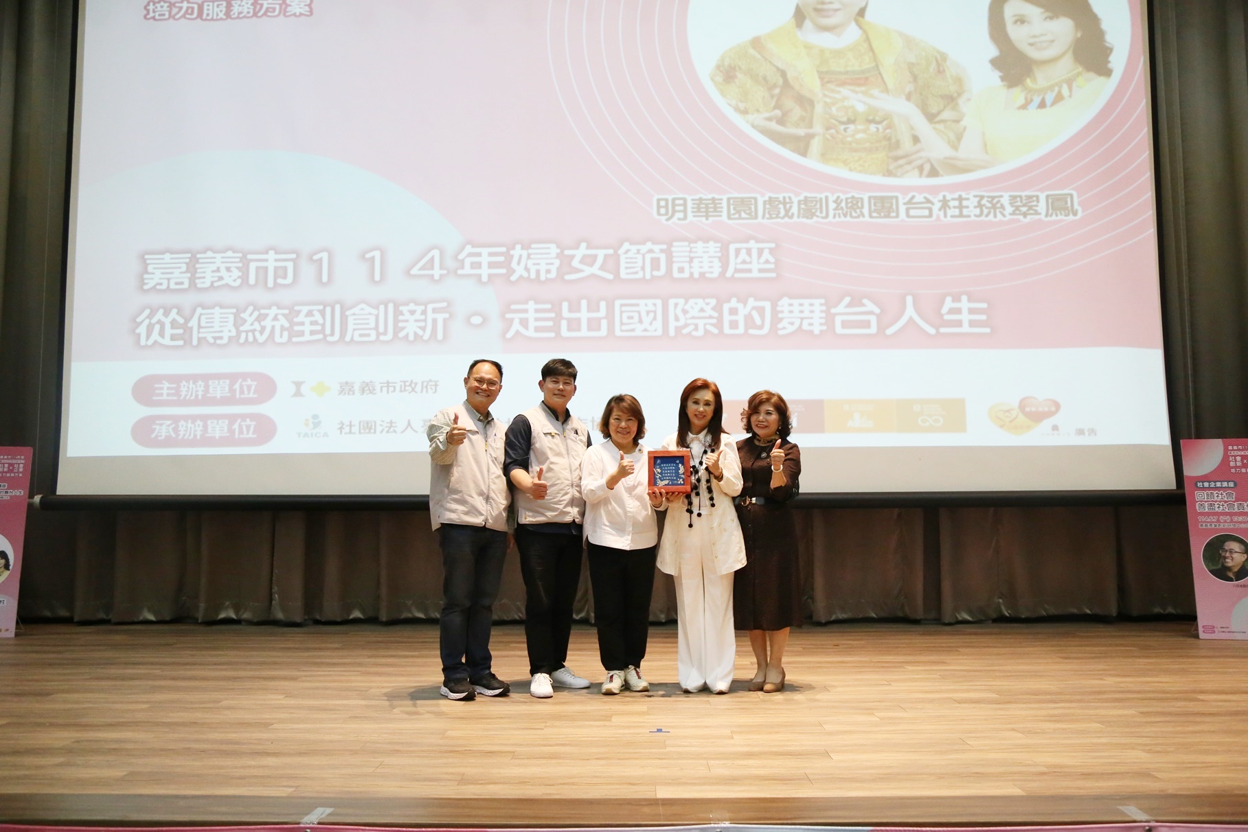 為慶祝國際婦女節,嘉義市政府於3月6日在市府9樓禮堂舉辦114年度婦女節講座,特別邀請明華園戲劇總團首席台柱孫翠鳳,以「從傳統到創新—走出國際的舞台人生」為題,與市民分享她的戲劇人生與奮鬥歷程。現場嘉義市長黃敏惠親自歡迎,並與孫翠鳳老師合唱經典曲目《身騎白馬》,氣氛熱烈。市府更精心準備「海拾創藝」海玻璃珠寶首飾禮盒與「幸物所」藍晒LED燈箱,展現嘉義市「嘉有社企 城市新活力」女性社企的豐碩成果。