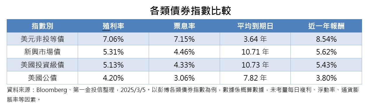 金融市場動盪之際,突顯債券資產抗波動特性,美元非投資等級債券較其他債券資產擁有高殖利率、高票息率及低存續期特性,目前殖利率水準在7.06%,票息率為7.15%,到期年限則為3.64年,過去一年投資報酬率為8.54%,綜合評估各項條件,相較優於投資等級債券、公債、新興市場債等信用資產。