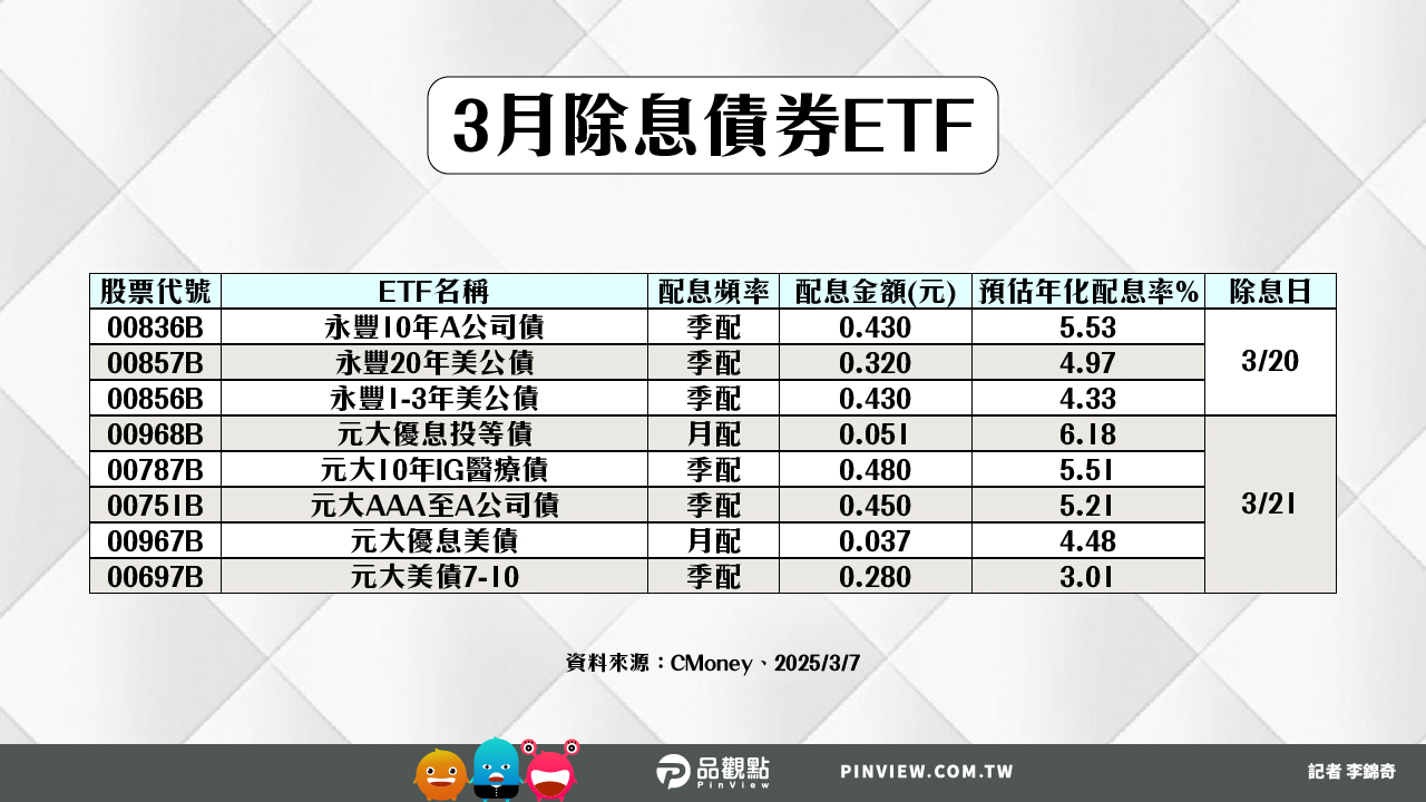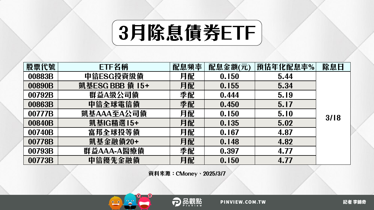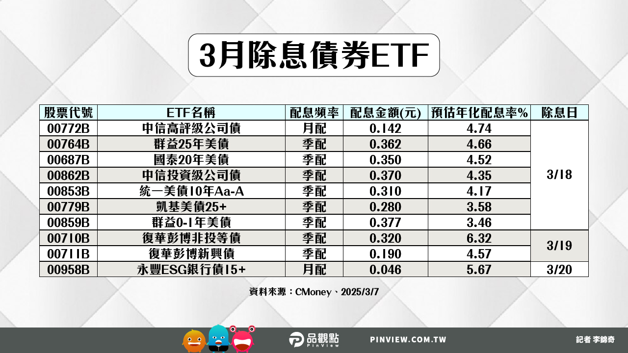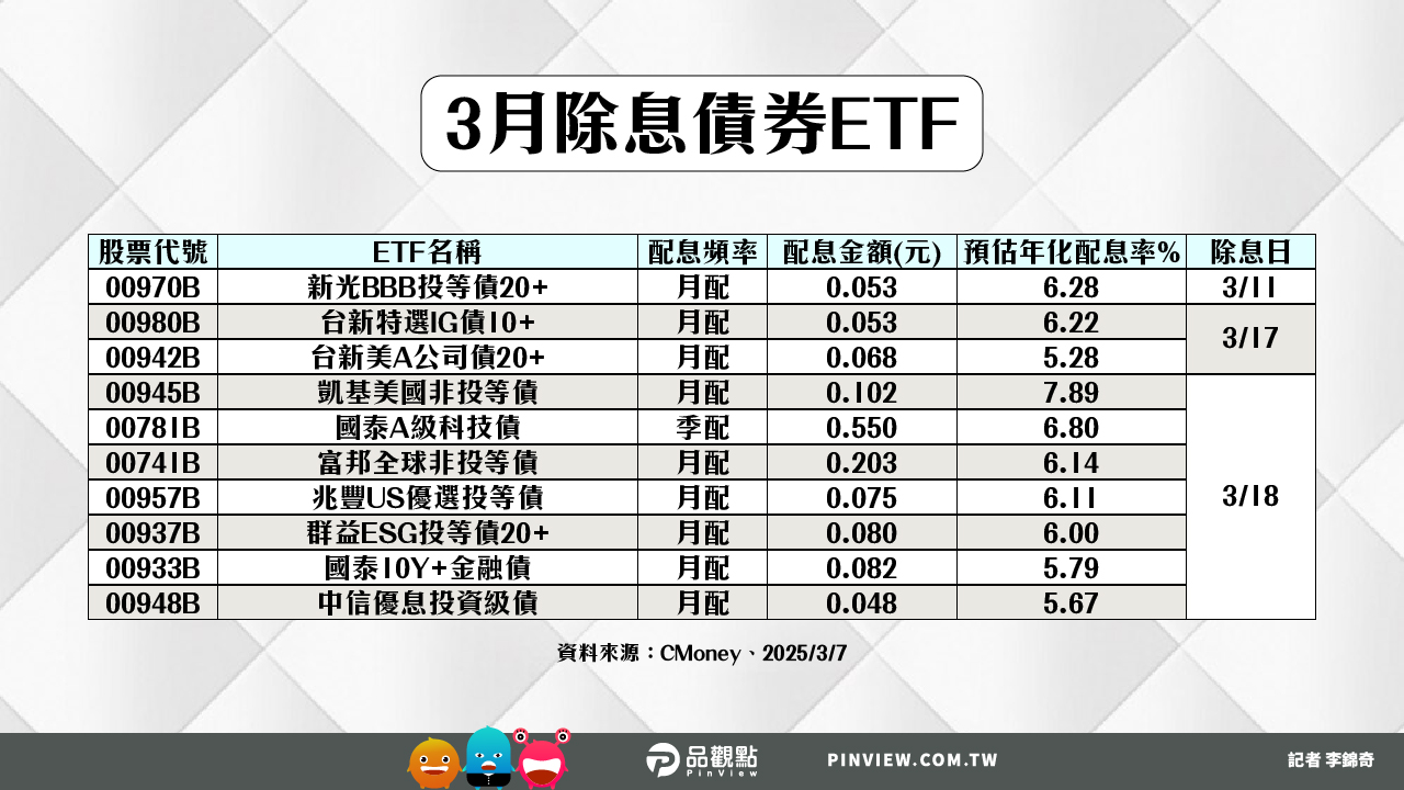 三月即將除息的債券ETF,最新統計還有38檔,其中年化配息率6%起跳的,一共有9檔,包括新光BBB投等債20+(00970B)、台新特選IG債10+(00980B)、凱基美國非投等債(00945B)、國泰A級科技債(00781B)、富邦全球非投等債(00741B)、兆豐US優選投等債(00957B)、群益ESG投等債20+(00937B)、復華彭博非投等債(00710B)、元大優息投等債(00968B)。
